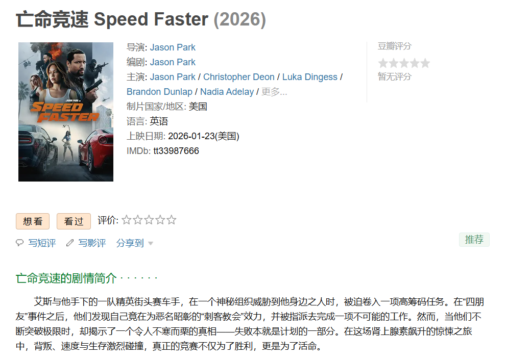 ❤️【最新上线犯罪动作片】亡命竞速 Speed Faster【2026】BD1080P [中文字幕] [6.2G]