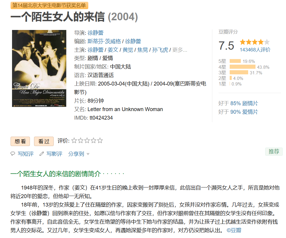 6、❤️【徐静蕾“毁三观”爆改名著的电影】一个陌生女人的来信【2004】BD1080P [国语中字] [5.4G]免费观看全集高清网盘资源