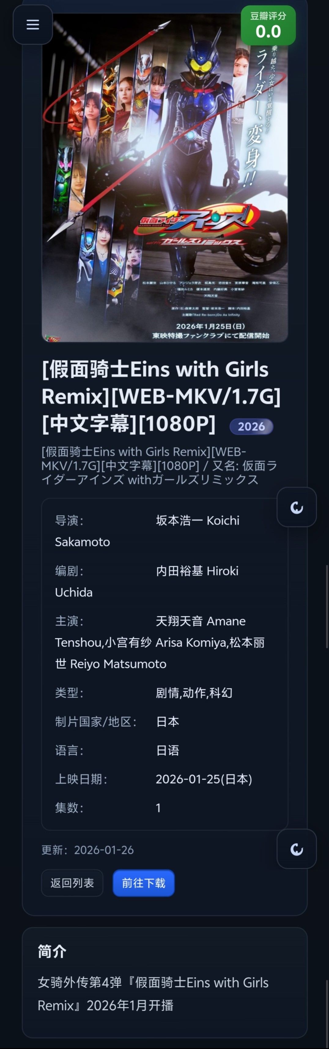 6、[假面骑士2026Eins with Girls Remix][WEB-MKV/1.7G][中文字幕][1080P]免费观看全集高清网盘资源
