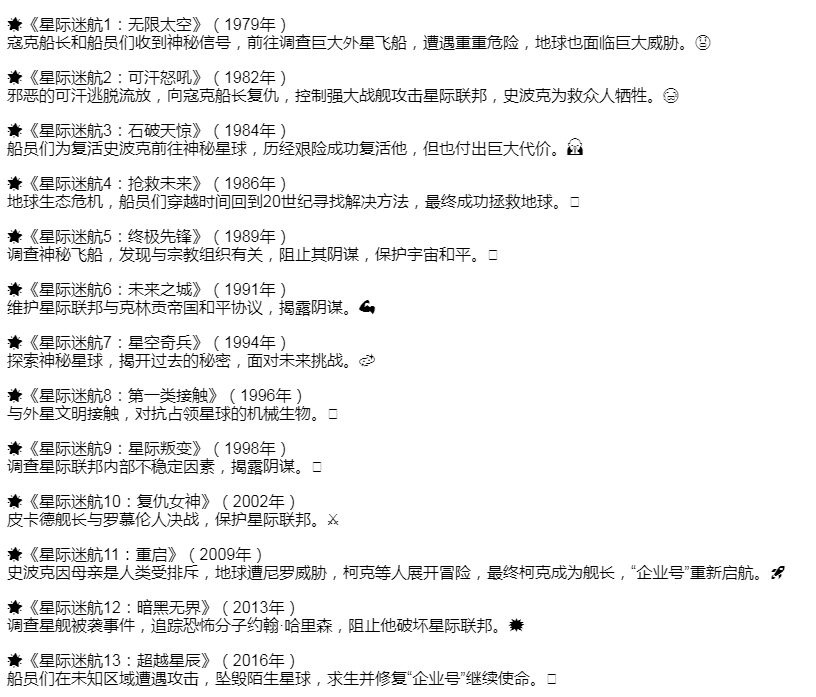 1、本贴标题:星际迷航/星际旅行系列合集【电影+剧集版+动画版】【1080P&4K 2160P】【外挂中英字幕】【1.2TB】