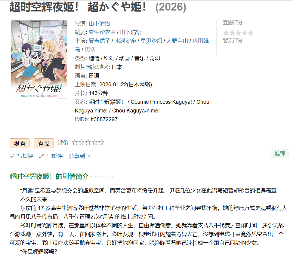 1、本贴标题:❤️【奈飞最新音乐动画大电影】超时空辉夜姬!超かぐや姫!【2026】BD1080P [官方中字] [5.1G]
