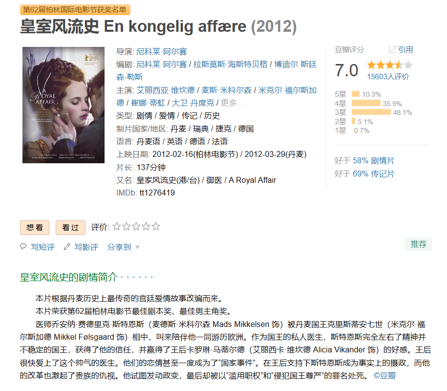 6、❤️【欧洲版"甄嬛传"】皇室风流史 En kongelig affære【2012】BD1080P [中文字幕] [15.3G]免费观看全集高清网盘资源