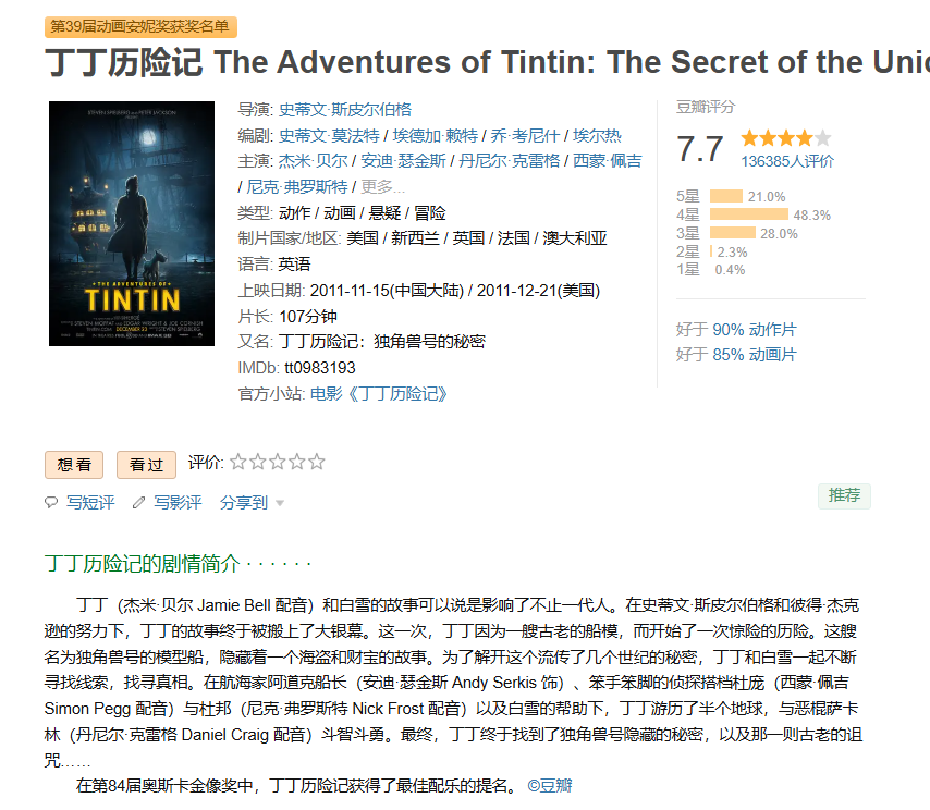 6、❤️【欧美爆火的冒险CG动画大电影】丁丁历险记【2011】BD1080P [中文字幕] [5.7G]免费观看全集高清网盘资源